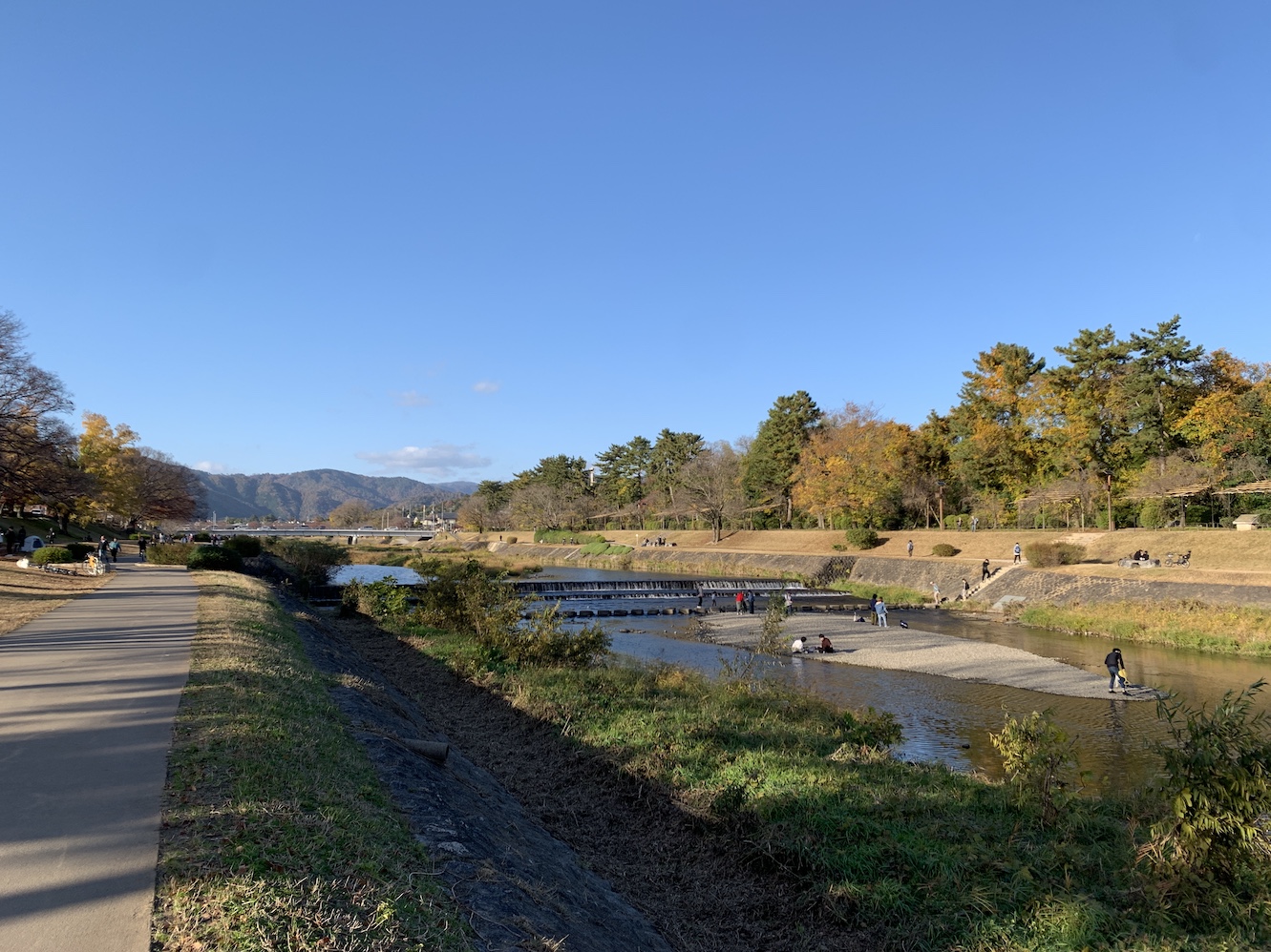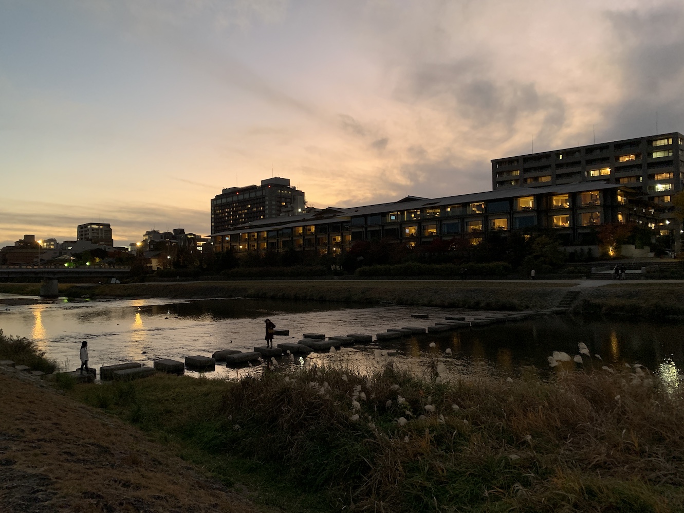 By contrast, Kyoto was like a commercial for the good life: warm and bright, split by the hale median of the Kamogawa into a grid of riverside parks and delicate wood houses. Long thin skerries dotted the river, covered with tall grass and patrolled by egrets and herons.