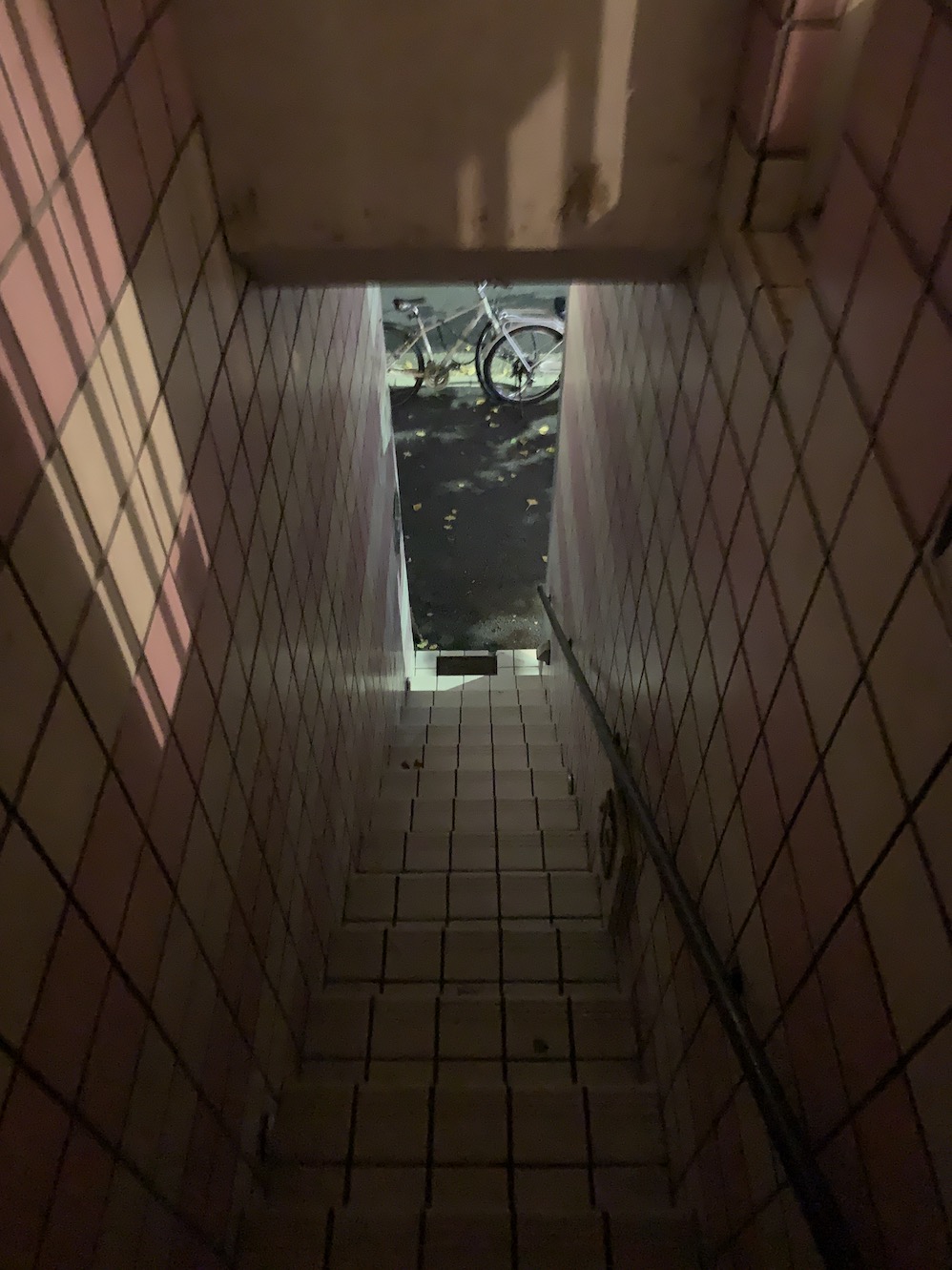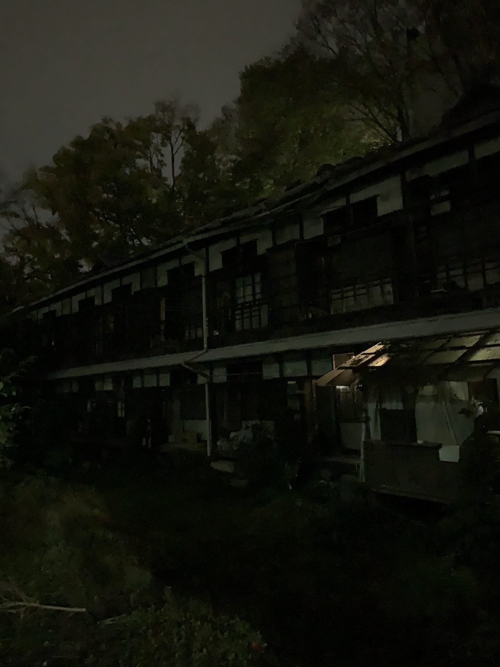 Upstairs it felt like I’d fall through the floorboards with each step. Yoshida used to be so packed that it was two to a room, but whole corridors were in darkness now. I put on my headlamp and ventured into one of the empty rooms, which had a little balcony looking over the courtyard.