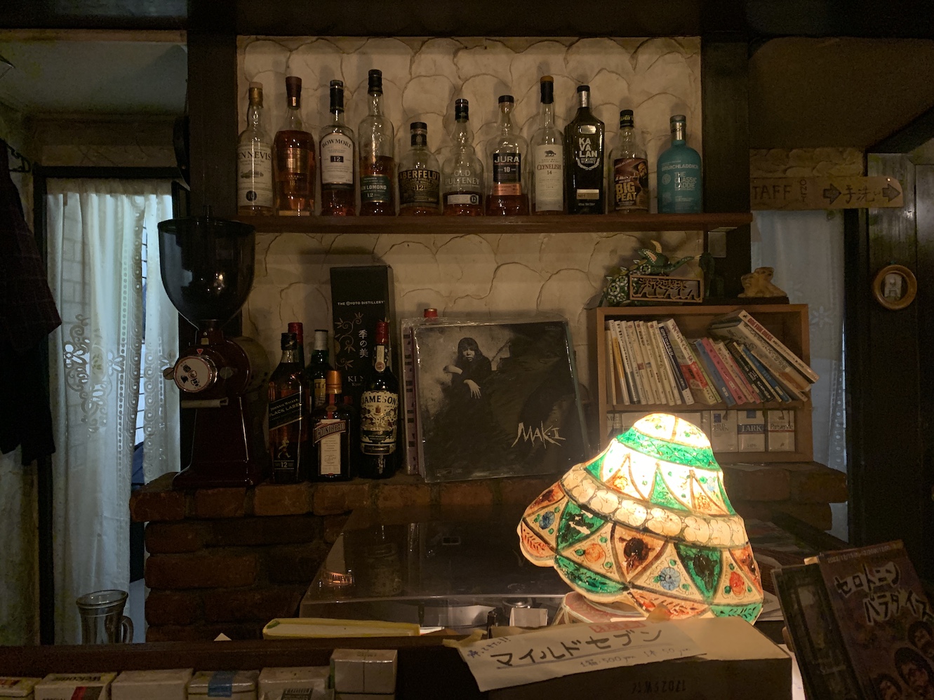 Bottles of scotch were arranged lovingly over the bar, which managed to fit a turntable, hundreds of foreign cigarette boxes arrayed like a curtain wall, and neatly tended piles of local memorobilia onto a work surface maybe three foot by two. Everything fell under the low, dazzling light of a stained glass lamp, slightly angled to cast the greatest illumination on Go’s hands as he worked.